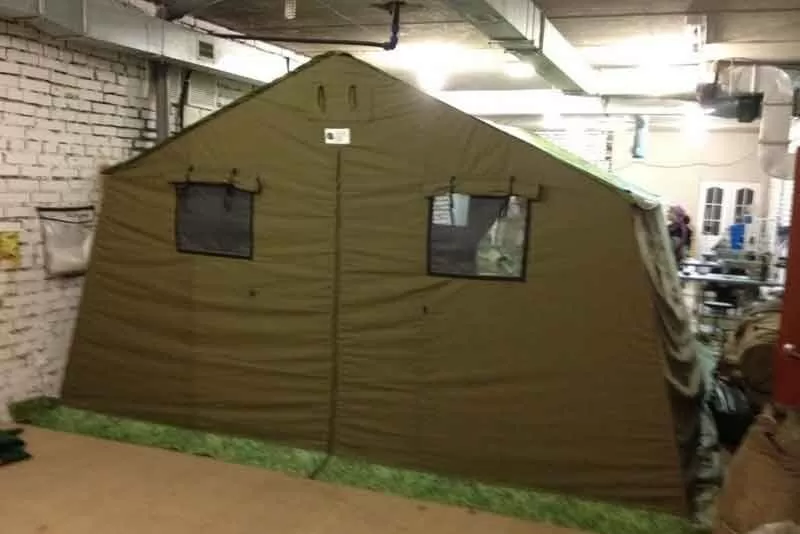Каркасная армейская палатка с двухскатной крышей, разделкой дымохода и москитными сетками на окнах.