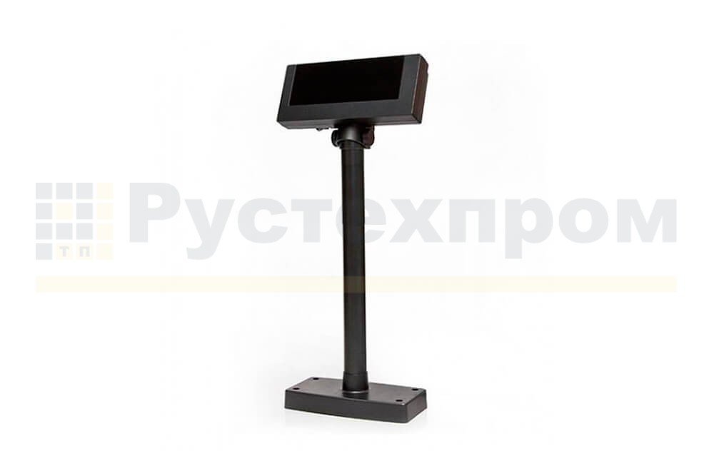 Дисплей можно устанавливать без стойки, непосредственно на основание. Информация выводится в 2 строки по 20 символов на каждой. Отображаемые символы крупные, четкие, яркие. Покупатель без труда может распознавать всю выводимую на дисплей информацию и оперативно отслеживать процесс покупки. Дисплей поддерживает не только кириллицу, но и международные знаки. Это позволяет его использовать не только при сопровождении процесса покупки, но и в рекламных целях для вывода информации о товарах и услугах.