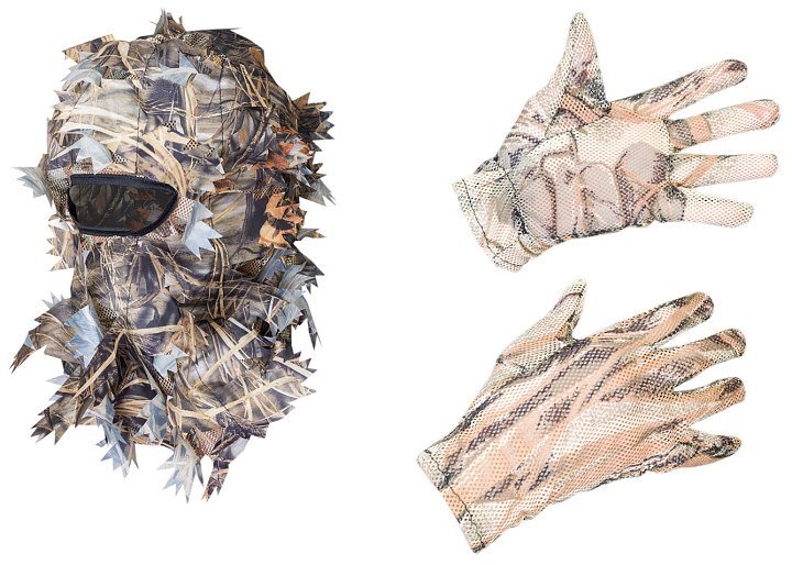Комплект предназначен для летней маскировки лица и рук. Используется как дополнение к маскировочному костюму охотника. Шлем-маска с объемной «листвой» закрывает всю голову, шею и лицо за исключением области глаз.