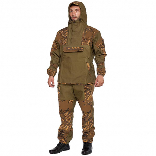 В Куртке-анорак конструкция рукава нового типа (по аналогии с костюмом «Смок»), обеспечивающая улучшенную «не стесняющую» эргономику движений в многослойной комплектации полевой одежды переходного осенне-весеннего периодов. Основные монтажные швы выполнены джинсовым швом «в замок» на специальном оборудовании. Кокетка спинки, центральная часть капюшона и кокетки ~ переда составляют одну цельнокроеную деталь из плащевой ткани, что повышает устойчивость плечевой области к промоканию. Входы в боковые карманы защищены специальной планкой, внутри объемного нагрудного кармана расположен влагонепроницаемый карман для документов. Усилительные накладки рукавов выполнены в виде карманов, внутри которых можно расположить «налокотники» из плотного полиуретана (поставляются отдельно по желанию заказчика) для дополнительной защиты локтей. Капюшон с козырьком — регулируется по форме и объему. Брюки имеют два объёмных боковых накладных кармана «герметичного» типа, два прорезных задних и два в боковом шве.