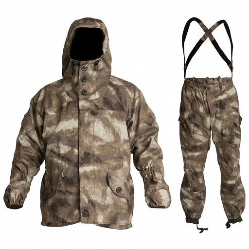 Костюм свободного кроя состоящий из: куртки, брюк и подтяжек. Крепление пуговиц усилено киперной лентой, 11 карманов, капюшон с козырьком, низ рукавов и брюк на резинке, брюки на резинке со шлевками, пыльники с завязками, пристегивающиеся подтяжки из резинки на пуговицах. Регулируемый капюшон с козырьком и утяжкой с фиксатором. Застежки-пуговицы для надежности крепления пропущены через киперную ленту. Два кармана с клапаном на пуговицах внизу. На каждом рукаве по одному карману, с клапаном на липучке. Внутренний карман из основной ткани (на пуговице). Манжеты рукавов стягиваются резинкой. Утяжка по низу куртки. Утеплитель Polar Fleece 180 гр/м2 с внутренней стороны. Брюки с широким поясом на резинке с шлевками под ремень. Два кармана сзади закрыты клапаном на пуговице. Два прорезных кармана сбоку, два накладных объемных сбоку по низу брючины с клапаном на пуговице. Брюки имеют отстегивающиеся подтяжки из резинки. Регулировка ширины низа брюк за счет резинки. Внутри по низу вставка из ткани бязь (100% х/б). Резинка в области голени для наилучшего прилегания к ноге.