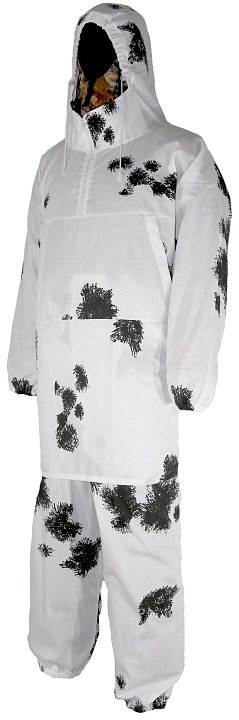 Маскировочный костюм «Метель» одевается поверх тёплой одежды и предназначен для зимней охоты. В этом костюме легко замаскироваться в зимнем лесу и на заснеженном поле. Костюм состоит из куртки «анорак» и брюк. Изготавливается из бязи с водоотталкивающей пропиткой и ацетатного шелка, ткань не шуршит. В солнечный день костюм не будет бликовать и благодаря камуфляжной окраске поможет вам максимально замаскироваться. Куртка костюма застёгивается на молнию, так же есть прорези, для быстрого доступа к карманам одежды. Голову охотника защищает стягиваемый капюшон с фиксатором. В пояс и низ брюк вшита надёжная резинка. В этом костюме вы не будете цепляться за ветки.