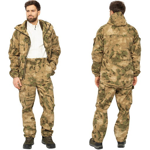 Куртка Особенности модели: – регулируемый капюшон с козырьком и утяжкой с фиксатором – пуговицы (НАТО) для надежности крепления пропущены через киперную ленту – два кармана с клапаном на пуговицах внизу – на каждом рукаве по одному карману, с клапаном на липучке – внутренний карман из основной ткани – резинка в области предплечья для лучшего прилегания к руке – манжеты рукавов стягиваются резинкой – утяжка по низу куртки Брюки Особенности модели: – брюки с широким поясом на резинке со шлевками под ремень – два кармана сзади закрыты клапаном на пуговице – два кармана прорезных сбоку, два накладных объемных с боку в области колена с клапаном на пуговице – брюки имеют отстегивающиеся помочи с широкой резинкой (50мм.) – брюки по низу стягиваются резинкой – резинка в области голени для лучшего прилегания к ноге – внутри по низу «пыльник» из ткани бязь (100% х/б)Штурмовой облегченный костюм «Горка V». Свободного кроя, крепление пуговиц усилено киперной лентой. 11 карманов. Капюшон с козырьком. Низ рукавов и брюк на резинке. Усиление на локтях, коленях и сзади. Брюки на резинке со шлевками. Смесовая ткань, рип-стоп.