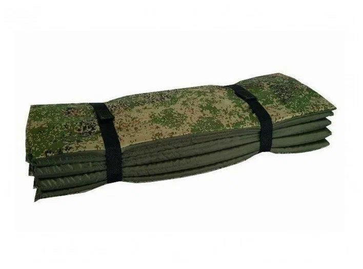 Коврик туристический полиуретановый теплоизоляционный складной обшитый камуфлированной тканью. Каремат используется для сохранения тепла и защиты прочего бивачного снаряжения от проколов на неровном рельефе. В сложенном состоянии коврик фиксируется торцевыми хлястиками.