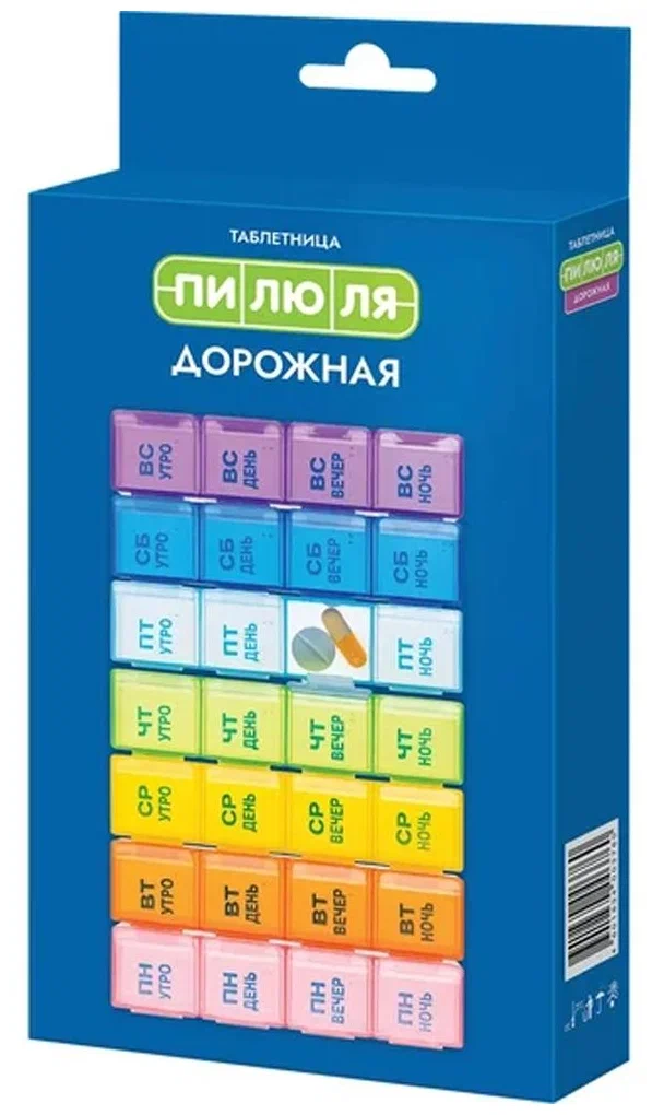 Содержит 7 отдельных контейнеров, которые соответствуют дням недели: ПН, ВТ, СР, ЧТ, ПТ, СБ и ВС. Каждый контейнер состоит из 4 отделений для распределения лекарств в соответствии с суточным режимом приема: утро, день, вечер и ночь. Для людей с ослабленным зрением нанесены символы Брайля. Способ применения: Откройте верхнюю прозрачную крышку таблетницы; откройте крышки контейнеров; разложите лекарственные средства или витамины по отделениям в соответствии с днем недели и временем суток; закройте крышки контейнеров; закройте верхнюю крышку таблетницы. Меры предосторожности: Перед использованием промойте таблетницу теплой водой с мылом и высушите ее. Материал: Пластик. Вид упаковки: Картон.
