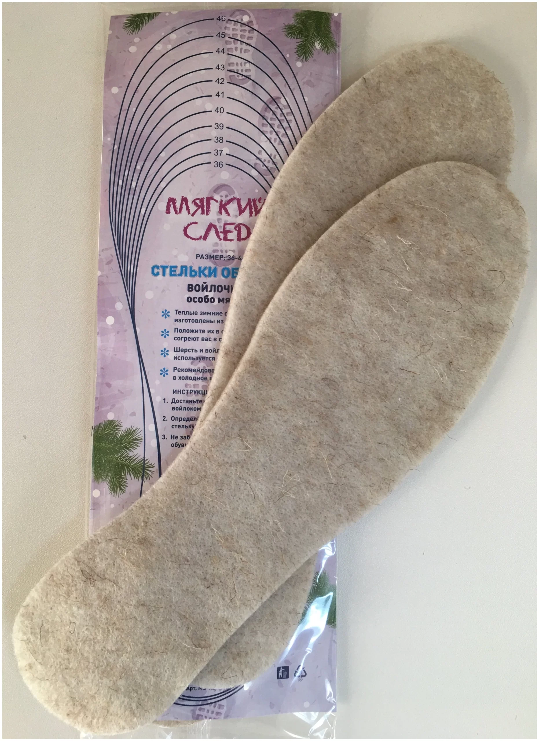 Стельки “Мягкий след” 1 пара. Особо мягкие войлочные обувные стельки. Теплые зимние стельки изготовлены из натуральной шерсти 80%. Положите шерстяные стельки в свою обувь и они согреют Вас в самую студеную пору. Шерсть и войлок издавна используются для термоизоляции. Рекомендованы к использованию в холодное время года. Не забывайте вынимать стельки из обуви и просушивать их. Стельки имеют универсальный размер от 36 до 46 .